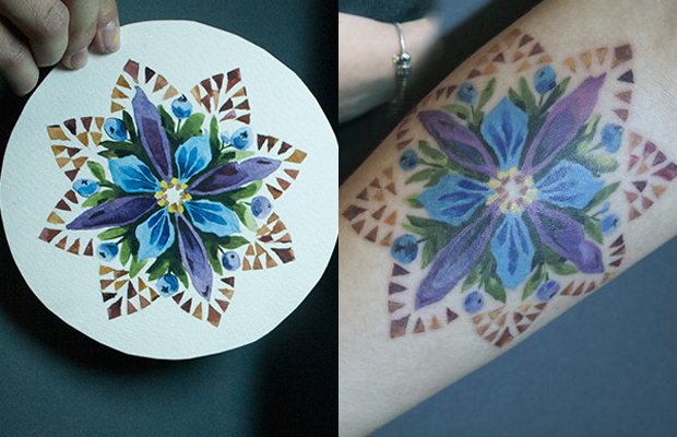 Originária de Kiev, ela auto-intitulou sua técnica de “live leaf tattoo”. “Eu nunca vi nada parecido com isso. Porém, antes de ter essa ideia, eu treinei muitos traços botânicos. Hoje consigo ver, por exemplo, no desenho de um trevo, que é algo bem popular, marcas da folha e detalhes que eu nunca tinha visto. Acho que é realmente uma abordagem única”.