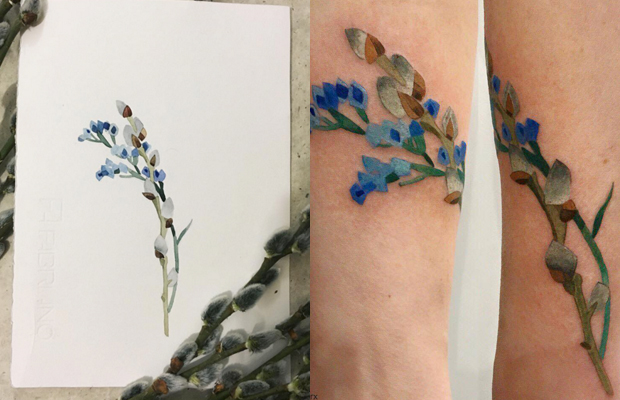 As tatuagens com inspiração botânica deram à ucraniana Rita Zolotukhina, a ‘Rit Kit’, status de celebridade internacional – tanto que já ultrapassou a impressionante marca de meio milhão de seguidores no instagram. Sua técnica é bem diferente das que costumamos ver, pois ao invés do estêncil utiliza carbono e plantas vivas, pressionando-as contra a pele, para criar os desenhos e marcar seus defeitos e ranhuras.